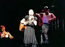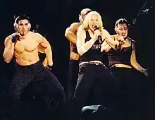 Her first concert tour since 1993's The Girlie Show, time was short and Madonna had to prepare everything within three months; auditions for dancers took place in New York in March and April and were personally supervised by the singer and dancer Christian Vincent.[7][8] Jamie King was appointed creative director and the tour's official choreographer; King recalled that the tour "was so hectic that I suffered from depressions and fell considerably ill".[9] Madonna had begun taking guitar lessons in 2000 with Monte Pittman and played both acoustic and electric guitar in four of the show's numbers.[8][10] Other personnel included Madonna's backup singers and dancers of 14 years Niki Haris and Donna De Lory, Ron Powell on percussions, Steve Sidelnyk on drums and French house music expert Stuart Price as bassist and keyboards player; the latter went by the moniker Jacques Lu Cont and had worked with the singer on remixes of Music.[8] In the end, the troupe was made up of ten dancers, two backup singers and six musicians; rehearsals went on for five days a week, thirteen hours a day.[11] Clair Brothers Audio support was roped in for providing a mixture of high-tech techno sound and fusion of acoustic and trance.[12] Madonna later clarified: "I don't see the point of doing a show unless you offer something that is going to mind-boggle the senses. It's not enough to get on stage and sing a song. It's all about theatre and drama and surprises and suspenses".[13]