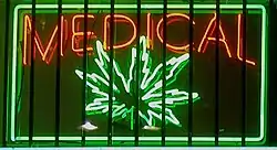 On November 5, 1996, 56% of voters approved Proposition 215 (also known as the Compassionate Use Act of 1996), taking effect the following day and removing state-level criminal penalties on the use, possession, and cultivation of marijuana by patients that "would benefit from medical marijuana" and possess a "written or oral recommendation" from their physician.[12] Conditions typically covered by the law include arthritis, cachexia, cancer, chronic pain, HIV or AIDS, epilepsy, migraines, and multiple sclerosis. Initially, there existed no set limits regarding the amount of marijuana patients could possess or cultivate.[12] California Senate Bill 420, also known as the Medical Marijuana Program Act,[13] was signed into law in October 2003 and took effect on January 1, 2004, establishing the amount of medicinal marijuana patients and/or their caregivers may grow and possess. The bill allowed for no more than 8 ounces of dried marijuana and/or 6 mature (or 12 immature) plants, unless larger quantities were recommended by a physician.[12] Senate Bill 420 also required the California Department of State Health Services to establish a voluntary patient registry and issue identification cards to patients, though no such registry has been established to date.[12]