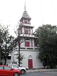 Nearby there is also a Clock Tower (Thai: หอนาฬิกา). It is a replica of the clock tower built up to replace the first clock tower in Bangkok that used to be in the nearby Grand Palace during the King Rama IV's reign, it was built with the drum tower restored in 1982 on the occasion of the 250th anniversary of the Rattanakosin (present-day Bangkok).[3] 13°44′47.84″N 100°29′40.17″E / 13.7466222°N 100.4944917°E