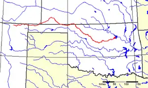 In Oklahoma it is further joined by North Carrizo Creek north-northeast of Kenton, Tesesquite Creek further to the east of Kenton, and South Carrizo Creek yet further to the east.[6] It additionally joins with Cold Springs Creek, Ute Canyon Creek, and Flagg Springs Creek before crossing into Kansas.[6] The river flows along the southern edges of Black Mesa, Oklahoma's highest point. As it first crosses the Kansas border, the river flows through the Cimarron National Grassland.