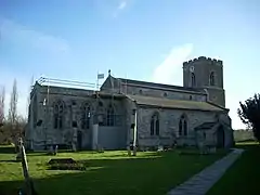 The parish church in the village has been dedicated to St Peter and St Paul since the 15th century. The building dates from the 13th century, and consists of a chancel, an aisled and clerestoried nave with north porch, and a three-storey west tower. The tower is the oldest part of the present building and dates from the 13th century, as does the majority of the chancel and nave, though the church was restored in the 19th century. The plain octagonal font dates from the 13th century.[4]