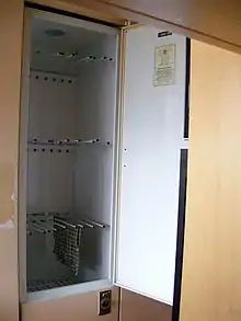 In both Europe and America, wealthier and commercial properties sometimes had drying cabinets or drying rooms associated with their laundry rooms. The cabinets were of wood or cast iron, with a series of drying racks on wheels which were pulled in or out of the cabinet horizontally. The cabinet was heated by coal, gas or wood. The Shaker community still uses these cabinets.[1] See also Airing Cupboard. However these cabinets and cupboards were intended for the general drying of laundry, whereas the modern cabinets are usually intended for items of clothing unsuitable for a traditional clothes dryer.