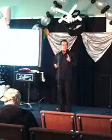 He was a featured lecturer at ClownFest 2004, a popular clown convention.[6] He was also a featured lecturer at the 2007 convention of The International Brotherhood of Magicians held in Reno, Nevada.[7] He produced and starred in a popular four-volume series of instructional videos on silk magic.[8] He also produced and appeared in the instructional video, "Simply Beautiful Silk Magic".