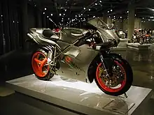 The Ducati 916 is a fully faired sport bike made by Ducati from 1994 to 1998.[lower-alpha 1] Featuring a 916 cc (56 cu in) fuel injected, 4-valve, desmo, liquid-cooled, 90° V-twin engine in a trellis frame with a single-sided swingarm and USD forks, the 916 is frequently cited as one of the most beautiful motorcycles ever.[5][6]