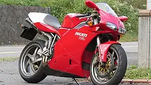 The Ducati 998 is a sport bike made by Ducati from 2002 to 2004. It was the successor to the Ducati 996 and the final variation on the Ducati 916. The new Testastretta engine shared many similarities with the previous Desmoquattro engine in the 996, although it was completely new from the crankshaft up. Testastretta means narrow head and refers to a complete redesign of the cylinder heads. The desmodromic valve actuation method was retained.
