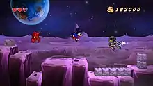 The original game's five levels are featured, all of which have been expanded, and can be played in any order. Each one includes new objectives that must be met to complete the stage, and all of the bosses have new patterns.[10] The game also features a full story plot, explaining the motives and reasoning behind each stage, including how Scrooge is able to breathe on the Moon.[11] Characters briefly featured in the original game, such as Magica De Spell, Flintheart Glomgold and the Beagle Boys play a greater role in the game's plot. The original game's hidden treasures are now found only on higher difficulties, and the game consists of only one ending.