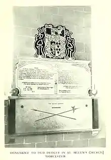 Dudley's last years are obscure. He probably lived in Friar Street, Worcester, where he had a house derived from his first wife's family.[18] He may have practised as a doctor there.[19] He married again and had a son in his old age.[20] He died in 1684, at age 85. He was buried in the parish church St. Helen's, Worcester (25 October 1684),[13] where he had erected a monument to his first wife, bearing the following Latin inscription (see illustration):