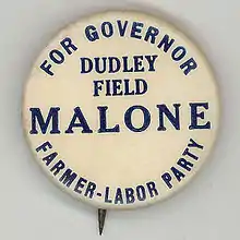 In 1920, Malone ran for governor of New York as the candidate of the newly organized Farmer-Labor Party.[7][8] In the 1920 election, he got only 69,908 votes out of over 2.8 million cast.[9] In 1920, he began to devote himself to his law practice, specializing in international divorce cases of wealthy individuals and becoming known as "the greatest international divorce lawyer." He established a branch office in Paris, along with former Judge William H. Wadhams.[1]