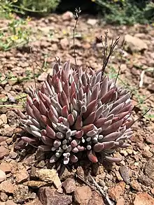 - Dudleya × semiteres (Rose) Moran — Occurs along the Pacific coast just north of Ensenada and on South Coronado & South Todos Santos islands. Caudex 1 to 3 cm thick, up to 15 cm high, branching to form clumps of 10 to 15 rosettes. Rosettes are 3 to 10 cm wide, of 15 to 30 ascending leaves. Leaves are green or glaucous, tapering uniformly with the sides roughly parallel in the bottom half. The leaves have a flattish or slightly convex ventral surface, and a convex dorsal surface, with the margins acute in the lower quarter of the plant but rounded towards the tip. Leaves are 3 to 10 cm long, 6 to 15 mm wide, and 3 to 6 mm thick.[10] Peduncle is 10 to 30 cm tall, 3 to 8 mm thick. Bracts are deltate-lanceolate, acute, with the lowermost 1 to 3 cm long, 3 to 7 mm wide. The inflorescence is composed of typically 2 to 4 ascending branches, with each branch typically 3 to 10 cm long. 3 to 12 flowers are mounted on the pedicels, of which, the lowermost pedicels are 3 to 8 mm long.[10] On the flower, the calyx is 4 to 5 mm wide, 4 to 6 mm high, segmenting into deltate-ovate to lanceolate sepals that are 3 to 5 mm long and 1.5 to 2 mm wide. Petals are white or cream, often with the keels lined in red, similar to D. a. subsp. attenuata. Petal shape is elliptic-oblong, acute, 8 to 10 mm long, 2 to 3.5 mm wide. The stamens are composed of filaments 5 to 6.5 mms long, with red or yellow anthers 1 to 1.5 mm long. The other presumptive parents of this recurrent hybrid are Dudleya brittonii and D. candida. × semiteres shares the chromosome count with its parents, having a chromosome number of n = 17.[10]