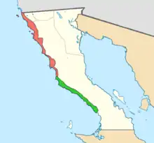 | Distribution of Dudleya attenuata subsp. attenuata (red) and Dudleya attenuata subsp. australis (green) | |