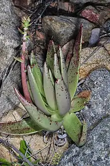 Dudleya ingens is a species of perennial succulent plant in the family Crassulaceae commonly known as the rock liveforever or Baja liveforever. A relatively large member of the genus Dudleya, this species has long green succulent leaves, and in April to June is characterized by pale yellow to white pink-tinged flowers topping tall, reddish inflorescences. It has a stem clothed densely with old, leathery leaves, and the inflorescence may be nodding, with the floral branches bearing the flowers tending to unfurl like the fronds of a fern. It is similar in appearance to Dudleya brittonii, but differs in range and chromosome number.[2] This species is endemic to the state of Baja California in Mexico, being found from Santo Tomás to the southern coast of the state.[3]