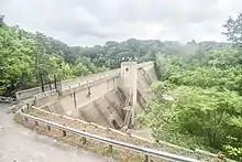 In 1975, trustees of Lake View Cemetery sued the cities of University Heights and Cleveland Heights to stop their sewer expansions upstream to the south, anticipating worsening of the flooding of the west branch caused by heavy rains.[9] The Cuyahoga County Court of Common Pleas had recently ordered the creation of the Cleveland Regional Sewer District (now the Northeast Ohio Regional Sewer District).[10] With the cemetery’s contribution of 10 acres (40,000 m2) of its land, the District constructed the massive concrete Lake View Cemetery Flood Control Dam in 1978 at an initial cost of $6,300,000.00, in spite of public criticism that the scope and cost of this solution far exceeded the severity of the problem. At the time of its completion, it was the largest concrete dam located east of the Mississippi River.[11]