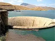 The Dukan Dam is a multi-purpose concrete arch dam abutted by gravity monoliths. It is 360 metres (1,180 ft) long and 116.5 metres (382 ft) high. At its base it is 32.5 metres (107 ft) wide, tapering off to 6.2 metres (20 ft) at the top.[10][14] The combined maximum discharge of the dam is 4,300 cubic metres (150,000 cu ft) per second. This is divided over a spillway tunnel with three radial gates having a combined maximum discharge of 2,440 cubic metres (86,000 cu ft) per second, and an emergency bell mouth spillway with a capacity of 1,860 cubic metres (66,000 cu ft) per second. Two irrigation outlets with a combined discharge of 220 cubic metres (7,800 cu ft) per second have not been operated over the last ten years. The powerhouse of five Francis units at 80 MW each releases between 110 and 550 cubic metres (3,900 and 19,400 cu ft) per second.[14] Lake Dukan, the reservoir created by the Dukan Dam, has a surface area of 270 square kilometres (100 sq mi). Its anticipated capacity is 6.8 cubic kilometres (1.6 cu mi) with a maximum of 8.3 cubic kilometres (2.0 cu mi).[10]