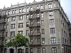 935 St. Nicholas Avenue is located in Upper Manhattan's Washington Heights neighborhood, at the southwest corner of St. Nicholas Avenue and 157th Street. It is a six-story masonry structure, built in 1915 in the Late Gothic Revival style. The ground floor appears as a raised basement, with horizontal bands of stonework between its windows. The middle four floors are essentially identical, with some columns of window bays featuring decorative carved panels between the floors. Top-floor windows are set in peaked-arch openings and have more elaborate surrounds. The building is crowned by a parapet with stone turrets and projections. A pair of entrance bays are located at the center of the St. Nicholas facade, the entrances deeply recessed in peaked-arch openings.[4]