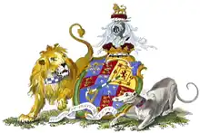 Dexter: a Lion guardant Or ducally crowned Azure; Sinister: a Greyhound Argent, each gorged with a Collar counter-compony Argent and Azure.