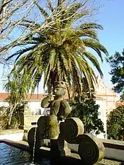 The gardens were implanted in the churchyard of the Franciscan and Jesuit convents, and still retains several vestiges of their use.[3] First, the Tanque do Preto, a water tank that was used historically for irrigating the gardens on the walkway towards the Alto da Memoria.[3] Apart from this pond, the tank is identifiable for its hybrid black statute/carving of a stylized Brazilian-Amerindian blowing water from a tube.[3] Another, is the group of four azulejo panels representing the prodigal son, which was produced in Lisbon around 1740, showing various figures, rural scenes and domestic life.[3]