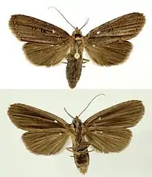 The length of the forewings is 12.5–13.4 mm. The forewing dorsal ground color is a mixture of gray-brown and beige scales. The veins are lined with gray, especially distally. The anal fold and cubitus are blackish brown and the orbicular spot is diffuse blackish brown. The reniform spot is small and blackish brown. The ventral surfaces of both wings are gray brown. The dorsal hindwing is dirty gray brown, but lighter near base.