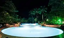The damage to the resort was described as being very severe, with much of the resort needing to be completely rebuilt. The usually cyclone-hardy palm trees were stripped.[42] The resort's pool was filled with sand from the storm surge, the function hall was gutted, and the health centre was unroofed. Almost all of the beachfront apartments had their walls torn off.[43] The gardens of the resort were stripped bare.