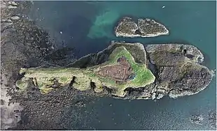 Sited between Stonehaven and the similarly situated Dunnottar Castle, the sea stack is in Strathlethan Bay, with Downie Point to the north and just offshore from the cliffs at Bowdun Head to the south. It is cut off from the mainland at high tide and the flat, grassy summit is entirely surrounded by precipitous cliffs some 30–35 metres (100–115 ft) high.[1][2] The conglomerate rock is lower Old Red Sandstone.[3] At the time of the hill fort the location may have been a promontory and subsequent erosion of the cliffs has turned it into a stack with a summit plateau about 20 by 12 metres (66 ft × 39 ft), much smaller than it was in Pictish times.[4][5][6]