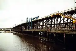 The staiths are reputed to be the largest wooden structure in Europe,[4] and are protected as a Listed Building and a Scheduled Ancient Monument. In 2002, work began on a development of riverside apartments and houses designed by Wayne Hemingway. Known as Staiths South Bank, this development celebrates the area's heritage as well as improving the setting for the historic structure. In the early hours of 20 November 2003, a section of the staiths was destroyed by fire.[5] As a result, access onto the Staiths themselves is not possible, but the structure can be viewed from the new riverside walkway, constructed as part of the Staiths South Bank development. In 2005 Gateshead Council commissioned a study into possible options for the Staiths' restoration. The Staiths suffered further fire damage in July 2010.[6] Following the award of a Heritage Lottery Fund grant of almost £420,000, restoration of the structure was planned in 2014[7] and completed by 2015.[8] It suffered further fire damage in 2019[9] and on 16 May 2020.[10]