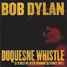 "Duquesne Whistle" is a song written by Bob Dylan and Grateful Dead lyricist Robert Hunter that appears as the opening track on Dylan's 2012 studio album Tempest. It was first released as a digital single on August 27, 2012[1] through Columbia Records then as a music video two days later. A limited edition "Record Store Day" 7" stereo single was released on November 23, 2012.[2] It was also anthologized on the 2014 reissue of The Essential Bob Dylan.[3] Like much of Dylan's 21st-century output, he produced the song himself using the pseudonym Jack Frost.