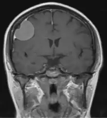 The dural tail sign (also known as "dural thickening", "flare sign", or "meningeal sign") is a radiological finding observed in magnetic resonance imaging (MRI) studies of the brain that refers to a thickening of the dura mater immediately adjacent to a mass lesion, such as a brain tumor.[1] Initially, the dural tail sign was thought to be pathognomonic of meningioma, a slow-growing tumor that arises from the meninges.[1] However, subsequent studies have shown that it can also be observed in various intra- and extra-cranial pathologies and in spinal lesions.[1] It is not a completely sensitive finding, as it is seen in only 60-72% of cases.[2] It is not completely specific either, as it has been described associated with lesions like neuromas, chloromas, pituitary diseases, granulomatous disorders, cerebral Erdheim-Chester disease, lymphomas, metastasis, hemangiopericytomas, schwannomas, and gliomas such as glioblastoma multiforme (GBM).[2][3] The final diagnosis should be further established through cerebrospinal fluid analysis or histopathological examination following a biopsy.[3]