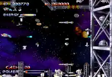 The weapon system is reminiscent of Thunder Force and Axelay;[2][3] There are three types of weapon units in the game the player's ship can acquire by collecting their respective colors via containers dropped by certain enemies when defeated and alternate between each one at any given time during gameplay, ranging from Lichtblitz (blue), Nordwest (red) and Rudel (green).[2] The weapon containers start as bonus points, and shooting them cycles through the three weapon types instead.[2] Collecting the same weapon type upgrades the player's ship with one of two satellite-like options that add firepower. These options can also be switched between back and forth positions by pressing the left shoulder trigger, as well as block incoming enemy shots.[2]