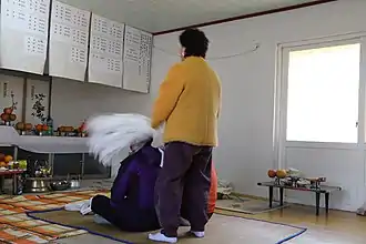 Once the patient is physically incapable of dancing further, the lead shaman talks to the patient, who is thought to be channeling the spirit within their body. The shaman identifies the sort of spirit that has caused the illness and continues the conversation, hitting the patient with a peach branch if the spirit's answer is not satisfactory.[2][34] Sometimes, the shaman will even twist the patient's legs or nose.[2] Over the course of the conversation, the patient confesses traumatic memories that they had repressed or were unwilling to face; this trauma is considered the moment when the malevolent spirit entered the body. Shamanism scholar Kang Jeong-sik suggests that the shaman acts as a sort of psychotherapist.[35] In the case of the 1984 ritual, the patient talked about having discovered a corpse in the factory toilets and encountering her dead father in her dreams.[34] Ultimately, the shaman forces the spirit to vow that it will depart from the body at a certain date and time. The shaman then makes the patient swear that they will live a healthy life once the spirit has left.[36] This procedure is called the daegim-badeum (lit. 'Receiving vows').[37]