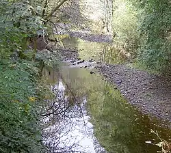 In 2000 recommendations to improve salmonid habitat in Dutch Bill Creek were made following a 2007 habitat inventory conducted in accordance with the methodology presented in the California Salmonid Stream Habitat Restoration Manual.[6][7] In 2009, the Gold Ridge Resource Conservation District (GRRCD), working with the Camp Meeker Recreation and Park District, removed the Camp Meeker Dam which had been identified as one of the worst barriers to salmon and steelhead passage in the Russian River Watershed.[8] Camp Meeker Dam had been built in the 1950s to create a seasonal swimming hole and beach area. In place of the dam, a prefabricated 80 foot steel pedestrian bridge was installed, improving public access across the creek, and stream banks were stabilized and revegetated, along with creation of a more natural meander and grade change.[9] These improvements will help return the natural transport of gravel from upstream and provide better fish habitat. The GRRCD also removed a culvert barrier to fish passage at Market Street in nearby Occidental, California.