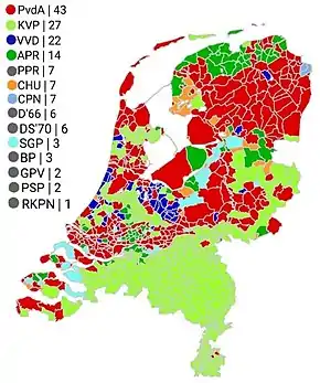 The elections led to a five-party coalition government consisting of the PvdA, the Catholic People's Party, the Anti-Revolutionary Party, the Political Party of Radicals and Democrats 1966 with the PvdA's Joop den Uyl as Prime Minister.