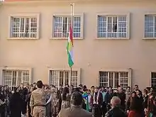 Every Saturday in this gym three students raise the Flag of Kurdistan and the principal with physical education teacher perform the raising of the flag, with performing the Kurdish National Anthem[2] Ey Reqîb, the picture shows raising of the flag at the gym in 2013 and 2014.