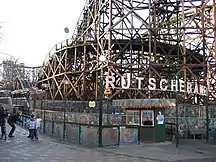 Bakken may have started as a place to get clean spring water, but today it is a thriving amusement park filled with modern rides and amenities. Bakken is home to five roller coasters, the most famous of which is Rutschebanen (lit.'Roller coaster'), a wooden roller coaster open since 1932. It was deemed a Coaster Classic by the American Coaster Enthusiasts (ACE)[4] until the end of the 2009 season, after which the trains were updated and the brakemen who rode along to control the speed were retired, leading ACE to rescind its Classic status.[5] The park is also home to dozens of other amusements and smaller rides suited for all ages.