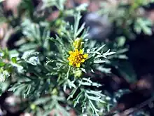 Fetid marigold is a erect multi-branching annual with a large taproot, common to anthropogenically disturbed areas such as roadsides, fields, and meadows, at elevations from 3000–6500 ft (914–1981 m).[3][4][5] Its height is 4–16 inches (5–70 cm). The leaves are simple and opposite, 3/4 in to 2 in (15–50 mm) long and linearly lobate.[6]