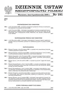 Dziennik Ustaw or Dziennik Ustaw Rzeczypospolitej Polskiej (English: Journal of Laws of the Republic of Poland, abbreviated Dz. U.) is the most important Polish publication of legal acts. It is the only official source of law for promulgation of Polish laws. The publication of this journal is solely the responsibility of the Prime Minister of the Republic of Poland. 'Dziennik Ustaw' traces its history to the 1918 'Dziennik Praw Królestwa Polskiego' (English: Journal of Laws of the Kingdom of Poland) and has changed its name several times during its existence.