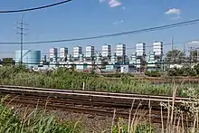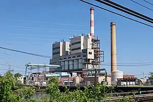 The facility occupies around 127 acres.[8] The main steam plant is in the Barnum Island census-designated place, while a parcel north of Barnum's Channel in Oceanside houses the gas turbine generators, and a parcel across the Long Beach Branch railroad tracks in Island Park hosts fuel tanks.[10] At 350 ft (110 m), the taller of E. F. Barrett's smoke stacks is among the tallest structures on Long Island.[11][12] The plant's namesake, Edward F. Barrett, was the LILCO president during 1937–1953, and died in 1958.[13]