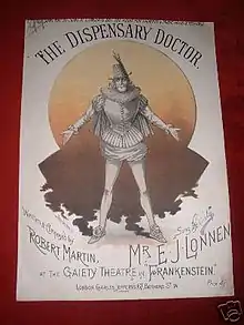 Lonnen made his London debut as Tancred in Falka at the Avenue Theatre in 1885[5] and subsequently starred in a series of successful musical burlesques at the Gaiety Theatre in London, including Monte Cristo Jr. as De Villefort (1886), Miss Esmeralda as Frollo (1887, in which he sang Killaloe, perhaps his most popular song),[7] Frankenstein, or The Vampire's Victim (1887), Faust up to date as Mephistopheles (1888), Carmen up to Data as José (1890) and Cinder Ellen up too Late as Prince Belgravia (1891). In 1892–1893 Lonnen toured with the London Gaiety Burlesque Company to Melbourne and Sydney, Australia.[6][8] Later, back in England, he starred in another burlesque hit, Little Christopher Columbus, as O'hoolegan (1893 at the Lyric Theatre), in the title role of the operetta Baron Golosh (1895 at the Trafalgar Theatre), and in La Béarnaise as Girafo (1896 at the Prince of Wales's Theatre). In the burlesque Monte Cristo Jr. at the Gaiety, he sang the song "Ballyhooly". He also starred in the musical comedy hit The Messenger Boy as Cosmos Bey (1900 at the Gaiety).[9]