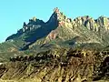 Eagle Crags is situated 2.5 mi (4.0 km) southeast of Rockville and 2.5 miles south of Zion National Park, and can be seen from Utah State Route 9. Topographic relief is significant as it rises 2,800-foot (850-meter) in two miles on its north side above the Virgin River which drains precipitation runoff from this mountain. Its nearest higher neighbor is Lower Mountain, 2 mi (3.2 km) to the south, Shunesburg Mountain is four miles to the northeast, and Smithsonian Butte is four miles to the west-southwest. The uppermost part of this mountain is composed of light-colored Jurassic Navajo Sandstone which overlays the deep-red sandstone of the Kayenta Formation. Access is via the 2.8 mile Eagle Crags Trail which passes through pinyon–juniper woodland, sagebrush, blackbrush, yucca, and cacti as it gains 900 feet of elevation to the base of the sandstone pinnacles, spires, and crags.[3] Views from the trail include Mount Kinesava, Johnson Mountain, and other landmarks within Zion National Park.[4] This geographical feature's name was officially adopted in 1934 by the U.S. Board on Geographic Names.[2]
