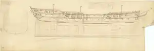 ![]() Plan of the Earl Talbot (1796), which the Royal Navy purchased on the stocks and launched as HMS Agincourt (1796). The Earl Talbot of 1797 was of the same size as its predecessor and almost surely used the same plans | |