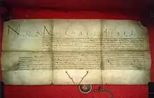 Reformation spread in the lands under the rule of John Sigismund.[38][39] The Diet of Turda of 1568 declared that the "faith is a gift of God", allowing each village to freely elect their pastors.[40][41] In practise, only four denominations – Catholicism, Lutheranism, Calvinism, and Unitarianism – enjoyed a privileged status.[40][42][43] Orthodoxy and Judaism were only tolerated, and all other denominations were forbidden.[33][40] [44] The Reformation also contributed to the spread and development of vernacular literature.[45] The first Romanian book (a Lutheran cathecism) was printed in Sibiu in 1544.[46] Decrees passed at the Diet of Transylvania were published in Hungarian from 1565.[47] John Sigismund renounced the title of king and adopted the new title of "Prince of Transylvania and parts of the Kingdom of Hungary" on 16 August 1570.[48]