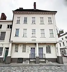 Johnson was born in Lichfield at 4:00 pm on Wednesday, 18 September 1709 at the family home above his father's bookshop, near Market Square, across from St Mary's Church.[1] His mother was 40 when she gave birth, a matter for sufficient concern that George Hector, a "man-midwife" and a surgeon of "great reputation", was brought in to assist during the birth.[5] The baby was named Samuel, after Sarah's brother Samuel Ford.[1] He did not cry and, with doubts surrounding the newborn's health, his aunt claimed "that she would not have picked such a poor creature up in the street".[6] As it was feared the baby might die, the vicar of St Mary's was summoned to perform a baptism.[7] Two godfathers were chosen: Samuel Swynfen, a physician and graduate of Pembroke College, and Richard Wakefield, a lawyer, coroner, and Lichfield town clerk.[8]