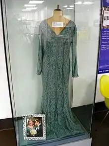 The wedding dress (on display at the Elstree and Borehamwood Museum in Hertfordshire) worn during EastEnders Live Week" by Laurie Brett as Jane Beale, for the character's second wedding to Ian Beale, played by Adam Woodyatt. The dress was designed to match the colours of the show's opening credits.