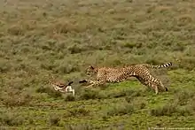 It usually eats medium-sized or large mammalian herbivores, such as antelopes. It preys on impala, Grant's gazelle, gerenuk, wildebeest, waterbuck, hare and guineafowl. It even feeds on other large mammals, such as plains zebras and ostriches on few occasions. Its favorite prey is the Thomson's gazelle. The gazelle is found mostly in savannas, grasslands and open fields of the Serengeti ecosystem of Tanzania and the Masai Mara ecosystem of Kenya, where the cheetah can chase and catch its prey at full speed.