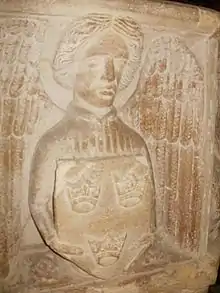 The three crowns appear, carved in stone, on the baptismal font (c.1400) in the parish church of Saxmundham,[29] and on the 15th-century porch of Woolpit church, both in Suffolk. They also appear in local heraldry and form part of the arms of the diocese of Ely and the arms of the borough of Bury St Edmunds, where the crowns are shown pierced with arrows to represent the martyrdom of Edmund the Martyr, the last king of East Anglia. Other users of the arms include the former Isle of Ely County Council, the Borough of Colchester and the University of East Anglia. The flag of Cambridgeshire (adopted in 2015) includes the three gold crowns on a blue field.[30]