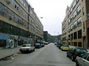 The section of Brooklyn that lies east of Bushwick Avenue, bordered by Metropolitan Avenue and Flushing Avenue on the North and South, is referred to some as being part of East Williamsburg since the region is part of EWIP. Factories and warehouses are being decommissioned due to heavy and light industry leaving the area, and were converted into loft and apartment space, similar to the residential development of the DUMBO neighborhood in Brooklyn An example of this can be seen in the adjacent picture which shows the two loft buildings on McKibbin St., 255 McKibbin and 248 McKibbin. At present it lies within the boundaries of Community Board 1, the Brooklyn Community Board for Greenpoint and Williamsburg.[11]