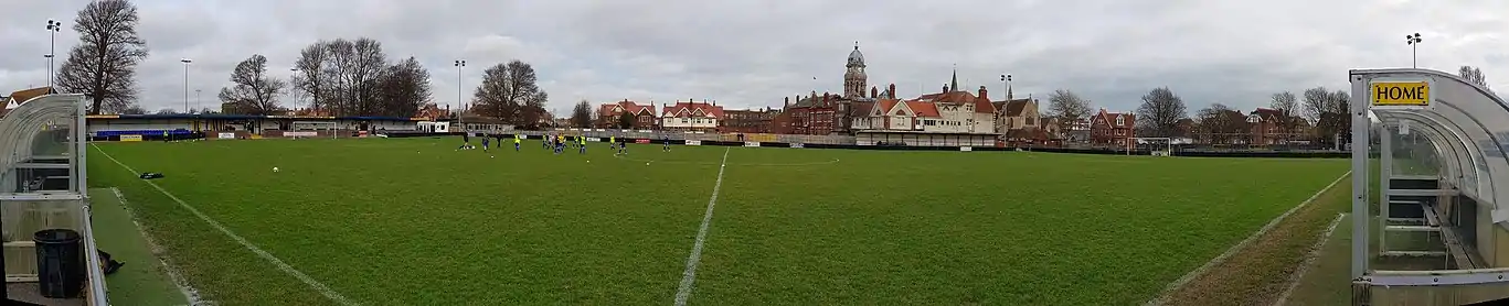 The ground is enclosed with a cricket pitch, hockey pitch and grass bowls surrounding three sides of the ground, all of which share a clubhouse. There is a capacity limit of 3,000 spectators and seating for 200. The gate house at the Meads Road end was built in 1914. 1994 Also saw the main stand and floodlights installed. There is also an uninterrupted view of the Town Hall, the chimes are often heard during home games.