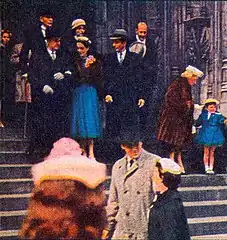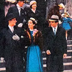The Bynoes exit the church in the company of another man. Tabby tries to grab the orchids but the Bynoes' companion wards him off. So Tabby ducks away into the crowd and begins to stalk them as the three walk up the avenue. Archie has been able to capture much of the action on film.