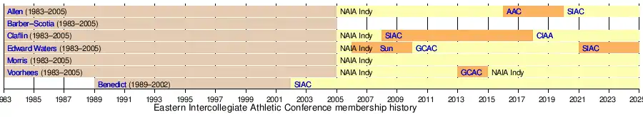 The EIAC disbanded in 2005. Barber-Scotia lost its accreditation and can no longer field athletics teams, while former members Benedict and Claflin moved up to the NCAA's Division II. The remaining members currently compete as NAIA independents.