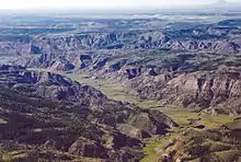 Though the prairie landscape of eastern Montana has traditionally been considered a part of the Great Plains, a recent (early 2010s) study has shown that, at least in some ways, the biomes of Eastern Montana have more in common and share more species with the Intermountain West scrub steppes and the Palouse of Eastern Washington than they have with the neighboring plains of The Dakotas.[5] Some parts of eastern Montana, in areas most prone to drying chinooks, have near-desert conditions and scrub rather than grassland.[6] Eastern Montana also has breaks and highlands that are widely forested, such as the Custer National Forest and areas around Fort Peck Lake, in contrast to the almost completely treeless plains of the Midwest.