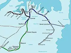 The Eastern Suburbs Railway (ESR) is a commuter railway line in Sydney constructed in the 1970s.[1] It is operated by Sydney Trains and has stations at Martin Place, Kings Cross, Edgecliff and Bondi Junction. In addition, it has dedicated platforms at Town Hall, Central and Redfern stations. All of these stations are underground. The Eastern Suburbs railway connects with the Illawarra line at Erskineville, forming the Eastern Suburbs & Illawarra Line. The line features turnbacks at Central, Martin Place and Bondi Junction. There was also previously a rarely used cross-over at Edgecliff. It operates a service every 3 to 5 minutes during weekday peak hours and 8 to 10 minutes at all other times.
