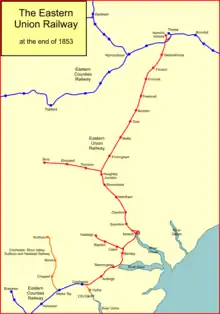 Location list during the lifetime of the Eastern Union Railway and the Ipswich and Bury Railway only; station names in bold are still open.